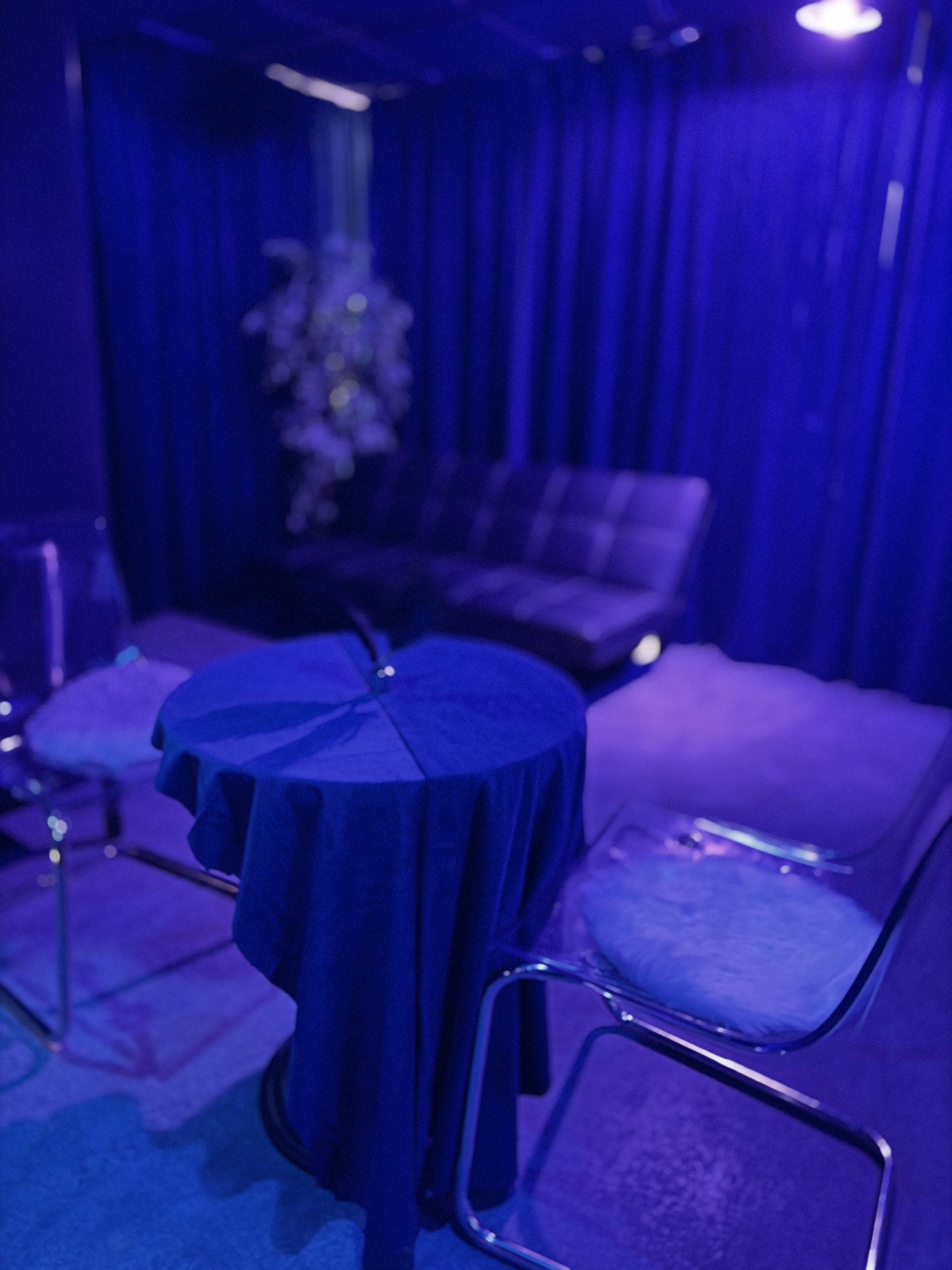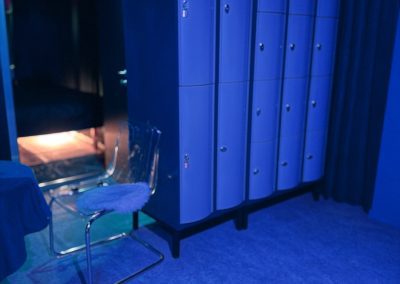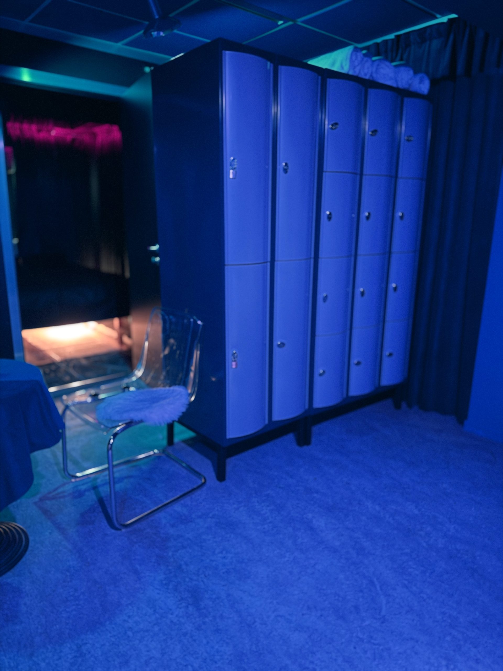 I direkt anslutning till det nya sängrummet hittar du vår nya provisoriska lounge och förvaring – en sexfri zon där du kan ta en paus, byta om eller bara njuta av samtal och närvaro. Här finns skåp och klädhängare för dig som vill låsa in dina värdesaker (ta med eget hänglås eller hyr ett för 20 kr). Du kan även lämna in värdesaker till personalen för säker förvaring. Loungeområdet är dessutom klubbens enda mobilzon – perfekt för en snabb check-in innan du återvänder till njutningens värld. Slå dig ner i soffan, ta ett glas vatten och mingla med likasinnade mellan akterna.